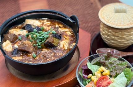 牛肉入り茄子と豆腐の麻婆 / サラダ / ザーサイ / 薬膳スープ / ご飯