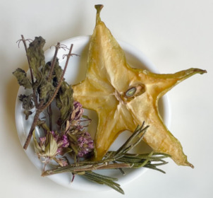 右上から時計回りに、乾燥スターフルーツ / ローズマリーの葉 / タイムの花 / ホーリーバジル