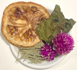 右上から時計回りに、乾燥スターフルーツ / ローズマリーの葉 / タイムの花 / ホーリーバジル